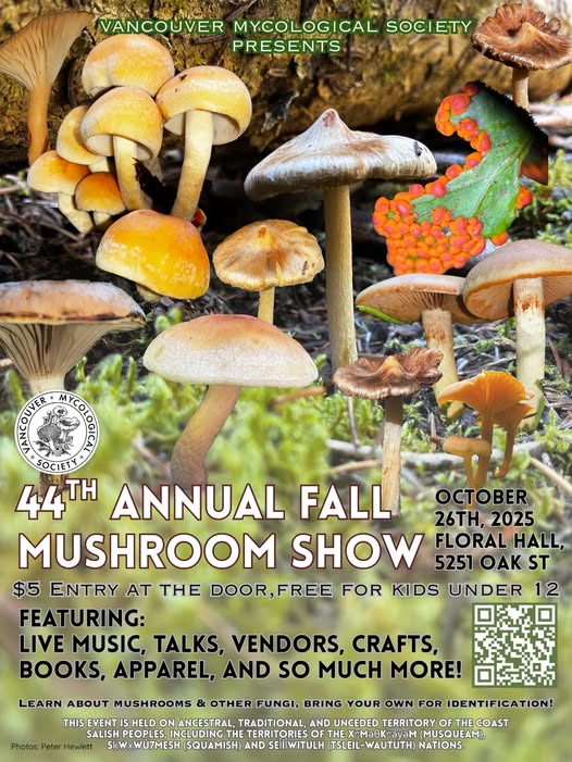 溫哥華真菌學會:年度蘑菇展 10 月 26 日 上午 10 點至下午 5 點溫哥華真菌學會:年度蘑菇展 屆時將有現場娛樂表演、藝術和手工藝、嘉賓演講以及令人眼花繚亂的展覽,定會讓您印象深刻。 屆時將舉辦一場服裝比賽,選出最佳蘑菇造型服裝,並提供豐厚獎品。 地點:範杜森植物園花廳及雪松室 時間:上午 10 點至下午 5 點 欲了解更多信息,請聯繫:info@vanmyco.com Post Views: 824 Previous Article 蘭利堡iMade本地市場 Next Article Made in the 604 秋季快閃集市