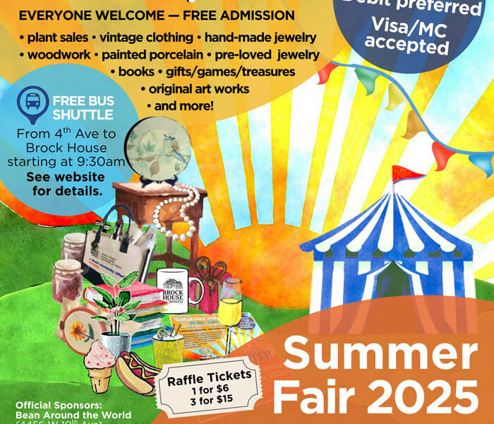 全家同樂!7月12日星期六上午10點至下午3點, 3875 Point Grey Road,Brock House 一年一度的夏季市集。免費入場音樂、美食、飲品、特價商品,老少咸宜:植物特賣復古服飾手工珠寶木製品彩繪瓷器二手珠寶、書籍和遊戲原創藝術品抽獎活動(一件6美元;三件15美元)等等!請自備購物袋。建議現金支付。 免費巴士接送:在阿爾瑪和海布里(靠近海布里)之間的第四大道北側乘車前往布洛克樓(上午9:30開始,每半小時一班)。