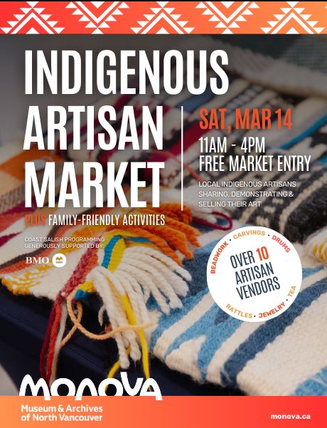 Read More →北溫哥華MONOVA博物館及檔案館,卑詩省北溫哥華西濱海大道115號 3月14日 時間:上午11點至下午4點 免費 春季來臨之際,歡迎您於3月14日蒞臨,與當地原住民手工藝者一起擺攤、分享和展示他們的作品。 本次春季市集的藝術家包括串珠匠、雕刻家、珠寶匠、羊毛織工等等!此外,中午12點至下午3點,我們還將舉辦家庭活動,包括海岸薩利甚羊毛編織體驗。