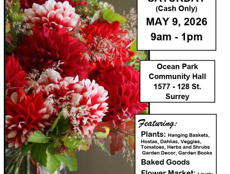 由南本拿比花園俱樂部举办的年度植物銷售會 Free Admission 2026年5月2日 上午10:00至下午2:00 7405 Royal Oak Ave, Burnaby