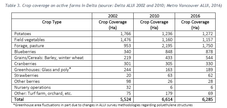 根據2021年農業普查,三角洲州共有177個農場,其中74個(42%)註冊為家族企業。三角洲州的農場進行著多樣化的農業活動。佔大溫哥華地區農場總數的8%。儘管數量不多,但這些農場的生產力很高,貢獻了該地區農業總收入的23%,土地面積超過9,400公頃,其中大部分位於農業用地儲備區(ALR)內。