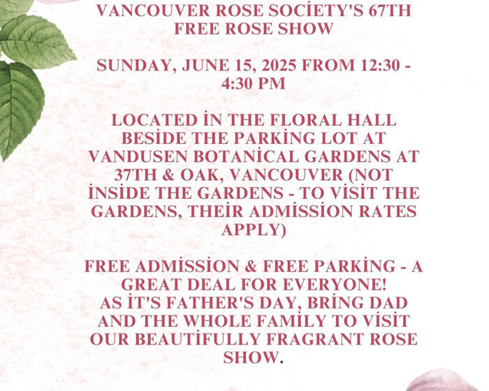 6月15日,星期日下午12:30 – 下午4:30花廳及雪松廳範杜森植物園 溫哥華玫瑰協會玫瑰展將於6月15日,星期日,下午12:30 – 下午4:30在範杜森植物園的花廳和雪松廳舉行。 門票:免費 *不含植物園門票。