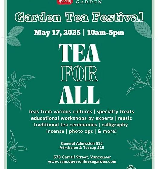 日期:2025年5月17日(星期六) 時間:上午10:00至下午5:00 地點:孫中山古典中國花園,578 Carrall St, Vancouver, BC V6B 5K2 門票:12加元/人。鼓勵遊客自備小茶杯(小於 40 毫升)。 花園茶節特價:15 加元(門票 +…