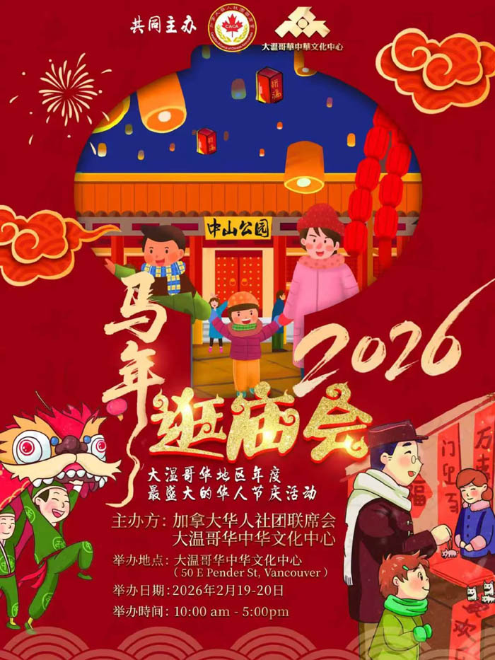溫哥華馬年新春廟會 加拿大華人社團聯席會 與 大溫哥華中華文化中心 聯合主辦的2026丙午馬年新春廟會,定2026年2月19日至20日在溫哥華華埠核心地標--大溫哥華中華文化中心盛大舉行。 主辦單位:加拿大華人協會聯盟 & 大溫哥華中華文化中心 地址:卑詩省溫哥華市東彭德街50號 (50 E Pender StVancouver, BC) 時間:2月19日及20日(星期四)上午10點至下午5點(太平洋標準時間) 活動概述 準備好體驗充滿活力的2026年溫哥華廟會吧!這是一場不容錯過的盛會! Post Views: 10 Previous Article 範杜森植物園家庭日 No Newer Articles