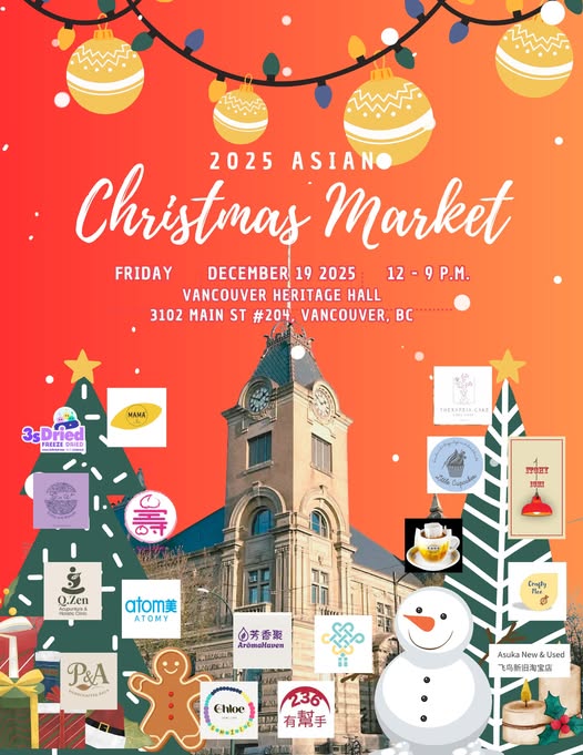 亞洲聖誕市集 一年一度,又來啦! 節日氣氛延續!上年 2024 亞洲聖誕市集嘅熱烈氣氛之後,2025 再接再厲, 好玩唔好俾佢停,繼續喺同溫哥華 Heritage Hall舉行亞洲聖誕市集! 日期:2025年12月19日 地點:溫哥華 Heritage Hall (3102 Main St, Vancouver, BC V5T 3G7) 免費入場! Post Views: 6 Previous Article 烏克蘭聖誕市集 No Newer Articles