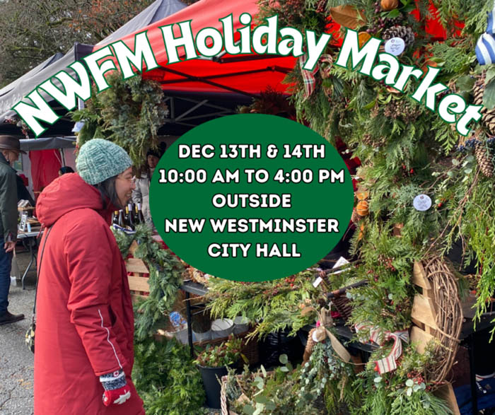 新西農夫市集將於12月13日至14日在市政廳外舉辦第六屆年度假日市集! 與您的朋友和家人一起過來寻找廚房裡儲備當地種植的農產品,並從 80 多名當地工匠那裡找到所有您圣诞节最後一刻的禮物!提供不間斷的現場音樂和娛樂表演、5 輛美食車以及從肥皂到烘焙食品、從巧克力到珠寶以及介於兩者之間的各種產品- 這是您享受充滿樂趣的慶祝活動並尋找完美獨特的一站式集市。 日期:2025年12月13日星期六 12月14日星期日時間:10:00 am4:00 am主辦單位:新威斯敏斯特農夫市集 新西敏市政廳 – 511 Royal Ave, 新威斯敏斯特, BC V3L 1H9 費用:捐贈!建議至少捐贈 5元——這筆款項將由我們和 BCAFM 營養優惠券計劃平分。
